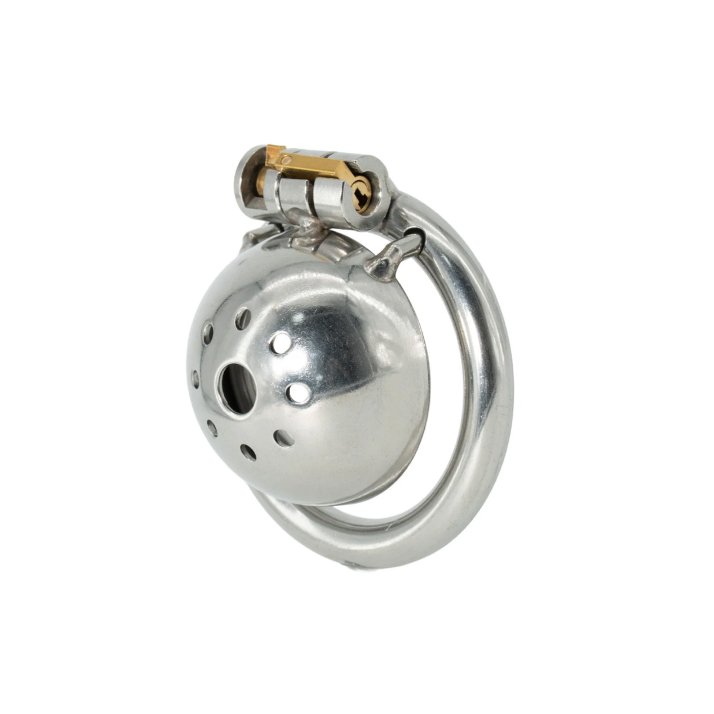 Krátká kovová klec na penis s uzavřenou ocelovou skořepinou.