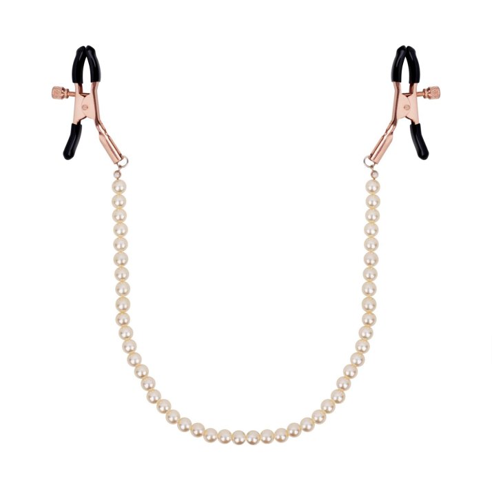 Kovové svorky na bradavky s nastavitelným tlakem a dekorativním řetízkem.