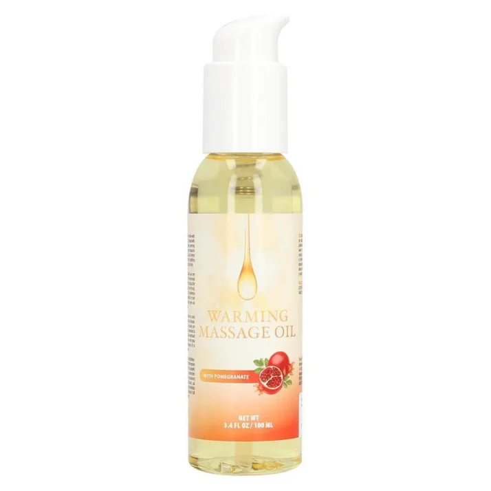 Masážní olej s hřejivými účinky a vůní granátového jablka.