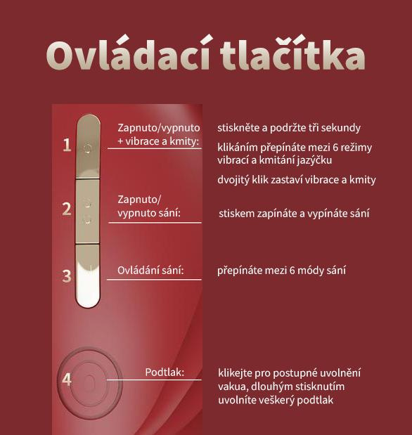 Zvon přiložíte na svá intimní místa. Přidržením krajního tlačítka pumpu zapnete a dalšími krátkými stisky měníte varianty kmitání jazýčku - 3 intenzity vibrací a kmitání a poté navazuje 5 variabilních programů. Ano, jazýček bude napodobovat orální sex a jemně dráždit váš klitoris.