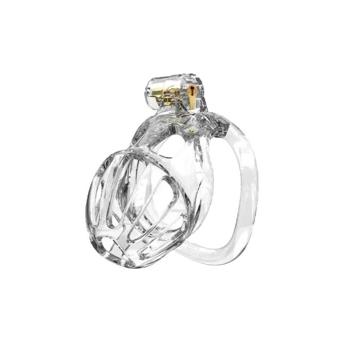 Plastový pás cudnosti pro muže, tzv. klec na penis. Velikost S má délku 6,5 cm.