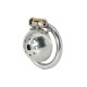 Krátká kovová klec na penis s uzavřenou ocelovou skořepinou.